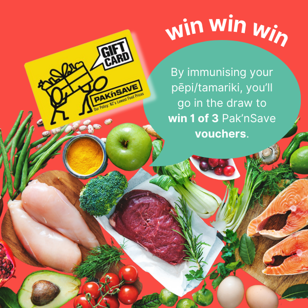- All māmā/whānau who immunise their pēpi or tamariki during this period will automatically be entered into the monthly draw to win 1 of 3 Pak’n Save vouchers, each valued at $300.