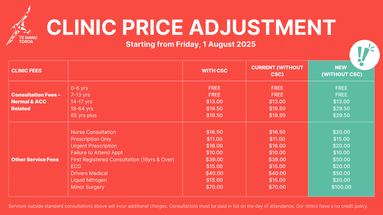 From Friday, 1 August, we are adjusting our clinic prices for patients who do not hold a Community Services Card (CSC). These changes are necessary to ensure we can continue delivering high-quality care to our enrolled whānau. The updated prices help us maintain 15-minute consultation times — allowing us to sit with whānau, understand their needs, and offer the right support.